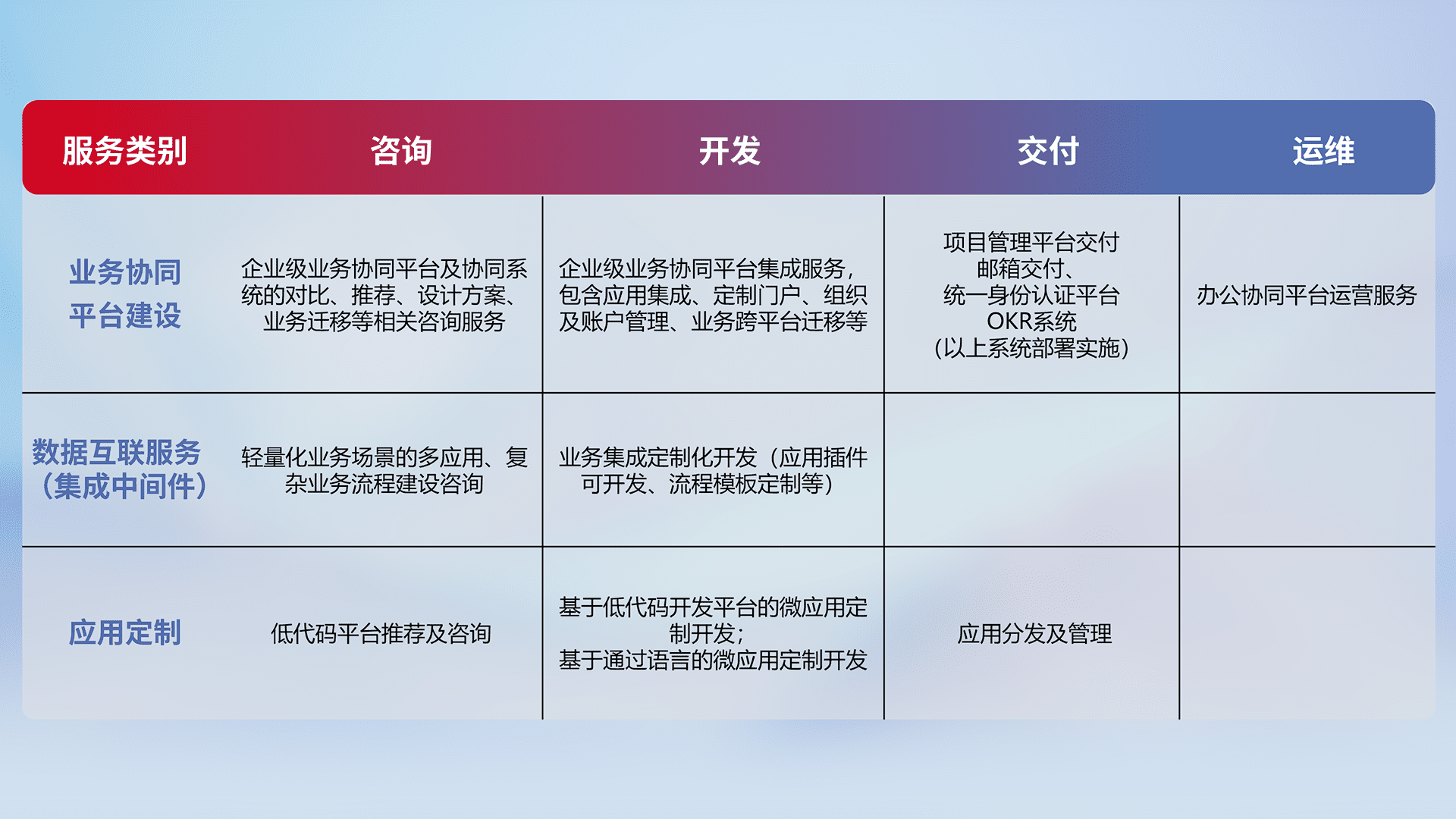 针对钉钉、、企微、、IDaas等平台级产品提供产品的规划、、方案、、、交付、、、、定制化开发等服务,,,,实现如统一协同办公、、、、智能客户服务、、、、混合会议管理、、、智能数据查询、、、、等业务场景,,,,实现数字化转型。。